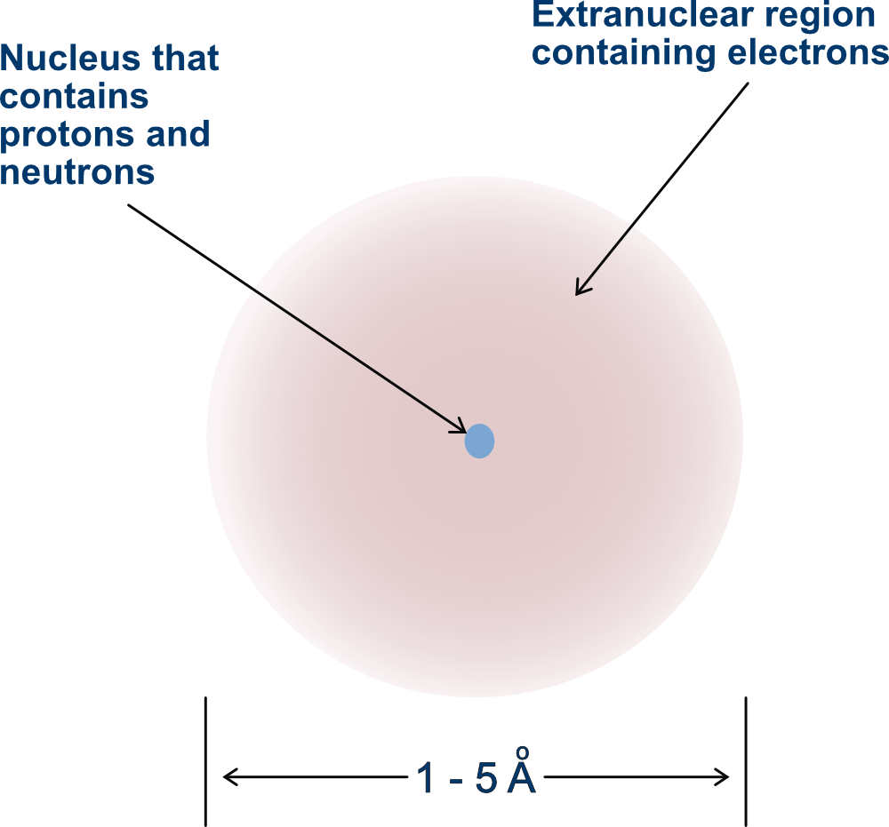 The negatively charged electrons, e–, are located in the extranuclear region. The volume occupied by the electrons is approximately 10-10 meters. The majority of the atom’s mass is in the densely packed nucleus. In a neutral atom, the number of protons is equivalent to the number of electrons. As you can see in the figure below, the majority of the atom’s volume is due to the electrons. This is because electrons are negatively charged and repel one another. The more electrons in an atom, the larger the volume or size of the atom.