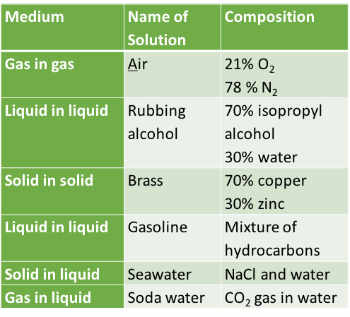 Returning to the saltwater mixture, let’s discuss how mixtures are described. Into 100 ml of water, mix 1 g of salt. The salt will completely dissolve, resulting in a clear, colorless mixture. In this mixture, the salt and the water are uniformly mixed. This is called a homogeneous mixture, which is also known as a solution. To say homogeneous solution is redundant and unnecessary. When considering solutions, most of us think in terms of liquids. In reality, homogeneous mixtures or solutions may consist of solids, liquids, or gases. Some examples are given in table below.