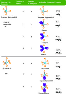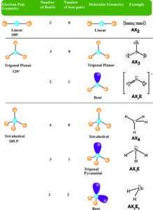 Discussed below are the electron pair and molecular geometries. There are five electron pair geometries: linear, trigonal planar, tetrahedral, trigonal bipyramidal, and octahedral.