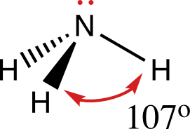 Ammonia has a tetrahedral electron pair geometry — it has 4 charge clouds with 3 bonds and one lone pair of electrons, AX3E. The molecular shape is trigonal pyramidal and the bond angles are 107o.