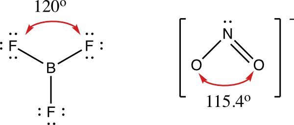 Boron trifluoride, BF3, has a trigonal planar electron pair geometry with bond angles of 120o. There are three charge clouds and zero lone pairs of electrons on the boron atom. The molecular geometry is also trigonal planar and is represented by AX3. The nitrite ion, NO2–, also has a trigonal planar electron pair geometry — there are three charge clouds. Two of them are bonds and there is a lone pair of electrons on the nitrogen atom. The molecular geometry is bent due to the lone pair of electrons compressing the bond angles to 115.4o and is represented by AX2E.
