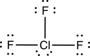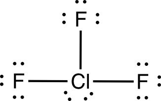 Chlorine trifluoride, ClF3, has a trigonal bipyramidal electron pair geometry. The molecular geometry is t-shape, AX3E2. The two lone pairs of electrons are in equatorial positions.