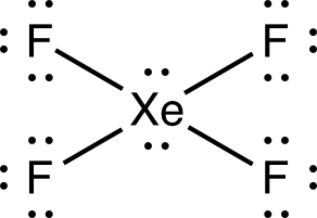 Xenon tetrafluoride, Xe4, has an octahedral electron pair geometry. There are 6 charge clouds and the VSEPR representation is AX6. The two lone pairs of electrons make the molecular geometry a square planar, AX4E2.