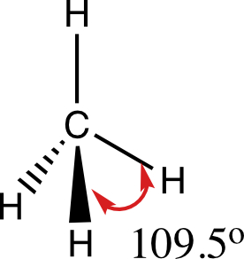 Note the structure for methane. This represents the three dimensional structure. The solid lines are in the plane of the paper, the dashed wedge is coming out of the paper toward you, and the solid wedge is going through the back of the paper away from you.