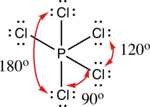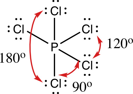 The bond angle between an axial bond and equatorial bond is 90o. If lone pairs are included, they will always take an equatorial position since there is more room. The molecular geometry for PCl5 is trigonal bipyramidal.