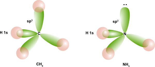 All atoms in a molecule that have a tetrahedral electron pair geometry are sp3 hybridized. The carbon in methane is sp3 hybridized as well as the nitrogen in ammonia as shown in the figure below. Note, the lone pair of electrons on nitrogen reside in an sp3 hybridized orbital.