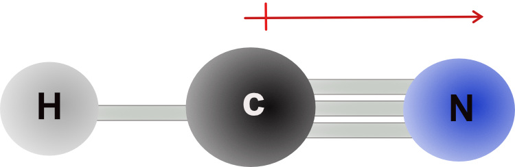Below is the structure of HCN which is also linear. The C-H bond is nonpolar, but the C≡N bond is polar. In this case, the bond dipole moments do not cancel and they are summed to give a dipole moment of 2.98 Debye.