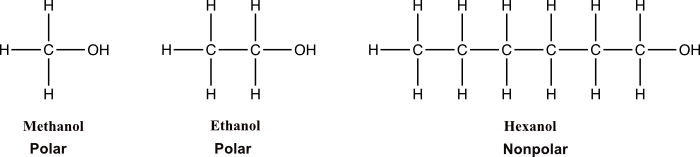 Many organic compounds, compounds that contain carbon, have polar groups. Usually if there are more than 4 carbon atoms, the molecule is considered nonpolar. For example, methanol and ethanol are polar, but the 6 carbon hexanol is much less polar. Because of its longer hydrocarbon chain, it has the characteristics of a hydrocarbon. The London dispersion forces of attraction are more important. Only a minuscule amount of hexanol will dissolve in water.