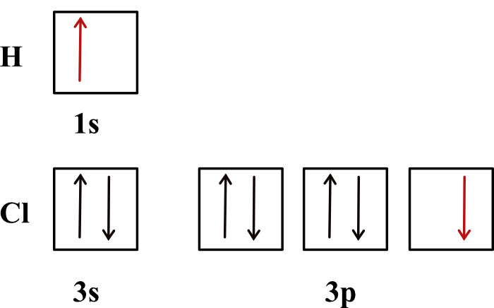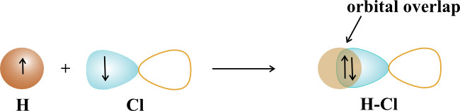 The hydrogen chloride bond, HCl, is formed from the overlap of a 1s orbital of hydrogen with chlorine’s 3p orbital. The 1s orbital of hydrogen has an unpaired electron and one of the 3p orbitals of chlorine has an unpaired electron. These are the orbitals that will overlap to form the H-Cl bond.