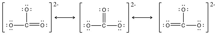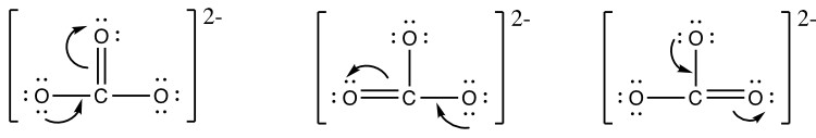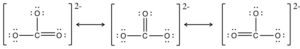 We see the three oxygens have octets but the carbon does not have an octet. We can move a pair of electrons from one of the oxygens to form a carbon-oxygen double bond. But, which oxygen? In fact we can draw three different structures. These are called resonance structures or resonance contributors. The atoms are all connected in the same way, the only difference in the structures is the location of the lone pair of electrons.