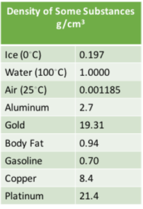 Density is a physical property of a substance and is useful in determining the identity of unknown substances. For solids, the volumes are stated in cm3, for liquids, the volumes are stated in mL, and for gases, the volumes are states in L. Recall, 1 cm3 is equivalent to 1 mL. Most substances will change in volume when heated or cooled making density temperature dependent. Water, at 3.98 oC, has a density of 1.0000 g/mL. This is because at 3.98 oC, a 1.0000 mL container will hold exactly 1.0000 g of water. At a temperature of 100.00 oC, the volume that is occupied by the water expands. The 1.0000 mL container can only hold 0.9584 g of water making its density at 100.00oC, 0.9584 g/mL. Temperature should be specified when reporting density.