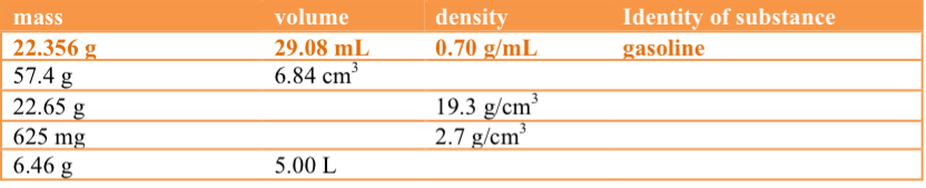\(\displaystyle\frac{19.31\;g}{1\;cm^3}\;or\;\frac{1\;cm^3}{19.31\;g}\)