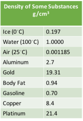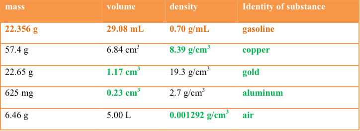 In the third line of the table we are given a mass of 22.65 g and a density of 19.3 g/cm3. The identity of the substance is most likely gold. We need to find the volume.