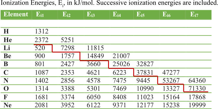 Electrons of an atom can be successively removed. The energy required to remove an electron is called the first ionization energy, Ei1, second ionization energy, Ei2, third ionization energy, Ei3, and so on. The table below has the ionization energies for the first and second period elements. The second ionization energy is higher than the first ionization energy because it will take more energy to remove an electron from a positively charged particle. The red vertical lines in the figure below show the difference in ionization energies for the valence electrons and the core electrons. For example, it can be seen that once the valence electron is removed from Li (1s22s1), the energy to remove an electron from the filled 1s subshell is significantly larger.