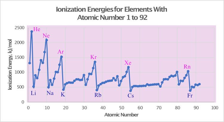 Plot of Ionization Energy, kJ/mol, vs atomic number for the first 92 elements