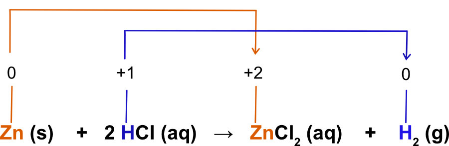 The oxidation number of Zn changes from 0 to +2. The oxidation number has increased meaning the atom has lost electrons. The Zn has been oxidized. The oxidation number for the hydrogen in HCl has changed from +1 to zero for the hydrogen gas. The oxidation number has decreased meaning electrons have been gained and the H+ has been reduced.