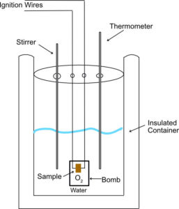 Constant volume calorimetry measures q at constant volume, qv. Constant volume calorimetry is also called bomb calorimetry. The bomb calorimeter is used to measure heats of combustion for foods, fuels, etc. The pressure is not constant, but the volume is constant meaning ΔV = 0, therefore, PΔV = 0 and ΔE = qv. We need to either know or determine the heat capacity of the calorimeter. The bomb calorimeter is consists of the sample, an ignition unit, oxygen, water, a stainless steel bomb, and an outer insulated vessel or dewar. The O2 and the sample are the system, and the rest of the calorimeter, the water and bomb, are the surroundings.