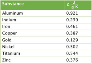 In the table below, are specific heat capacities for some common substances. Notice, that water has the highest specific heat capacity. It will take more heat to raise the temperature of 1 gram of water than it would take to raise the temperature of 1 g of iron or 1 g of steel.