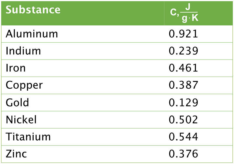 The specific heat capacity of our unknown metal is 0.434 J/(g⋅K). This, combined with other analytical techniques would allow us to identify the metal.