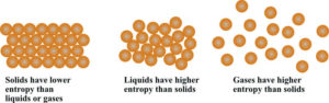 It is obvious that enthalpy is not the only factor that predicts if a reaction or process is spontaneous. In fact, entropy is a thermodynamic quantity that measures or describes the molecular randomness of a system. A system of gas particles has a higher entropy than the particles of a liquid, and the particles in a liquid have a higher entropy than the particles of a solid. Entropy is represented by a capital S and has units of J/K.